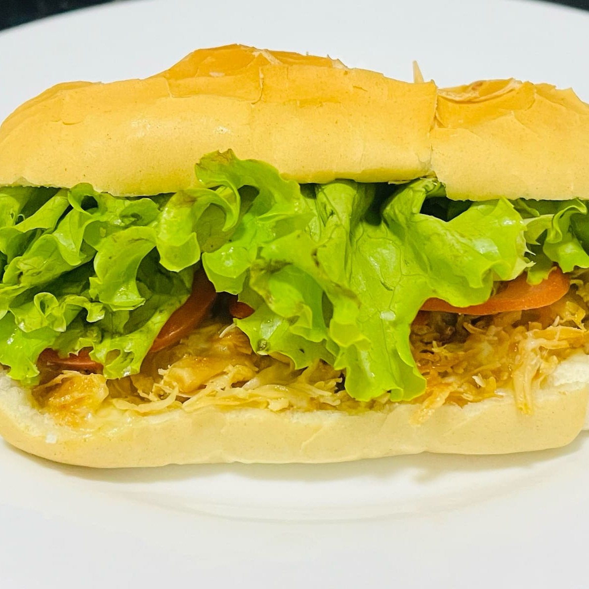 Pão francês, frango desfiado temperado, Mussarela, tomate e alface. Deliciosa combinação. Aproveite e faça seu pedido.