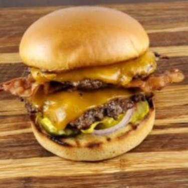 Lanche X-Bacon! Suculento bife de hambúrguer, bacon crocante, presunto, mussarela derretida, alface fresquinha, tomate suculento, milho crocante, batata palha crocante e os deliciosos toques de ketchup e maionese.