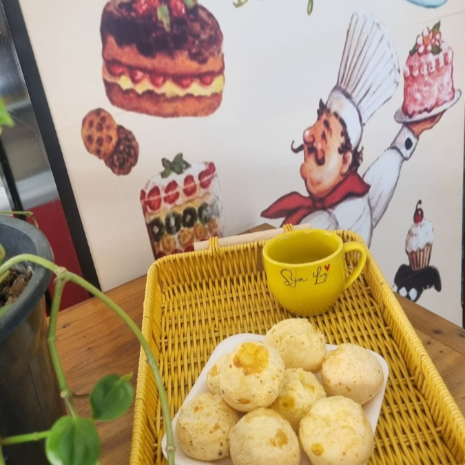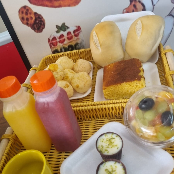 2 Sucos sendo 1 Laranja e 1 Morango, 6 Pão de Queijos, 2 Pães de Sal, 1 Salada de Fruta, 1 Pedaço de Broa ,2 Docinhos Deliciosos