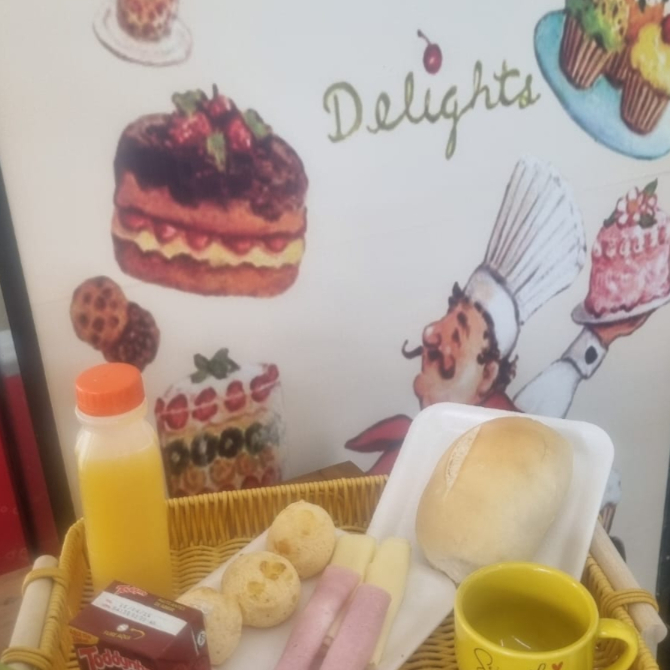 1 Toddyn, 1 Pão de sal e Suco de Laranja 300Mlho,3 Pão de Queijos, 2 Fatias de presuntos, 2 Fatias de Musarela