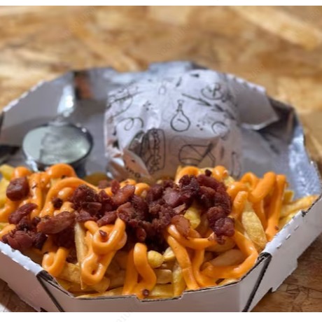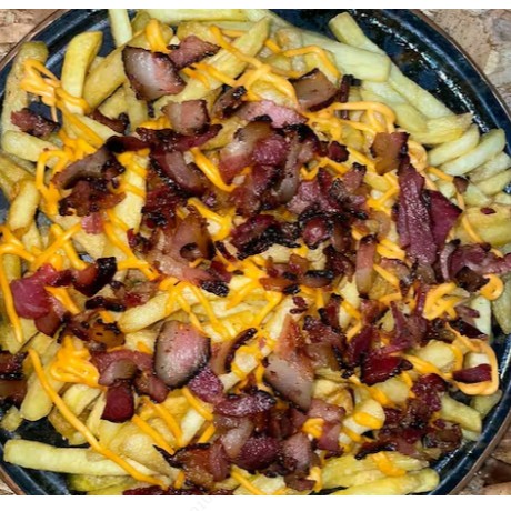 Porcão de fritas com aproximadamente 800g de fritas com cheddar cremoso e bacon