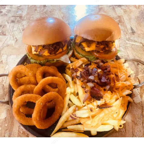 2 Hambúrgueres: Pão de Brioche, Hambúrguer de Costela de 130g, Queijo Cheddar, Bacon em tiras, Alface Americana e Tomates. Acompanha Onion Rings, 400g de Batata Fritas com Cheddar e Bacon