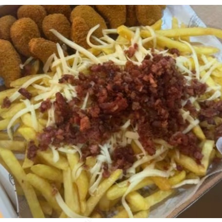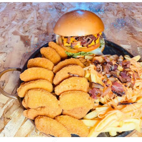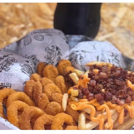 Deliciosa porção com aproximadamente 400 de batata frita com cheddar e bacon ,nugguets crocantes e onions rings.