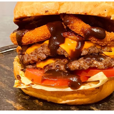 Pão de Brioche macio, 2 hamburguer 130g cada, Queijo Cheddar, Bacon crocante, Onion Ring,pimenta japaleno, Alface Americana, Tomates e Molho chiplote.