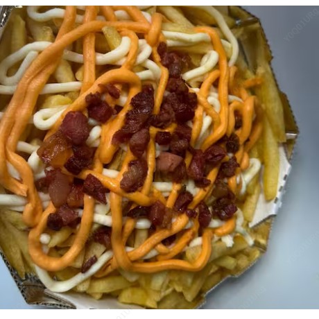 Porcão de fritas com aproximadamente 800g de de fritas com cheddar cremoso, Requeijao cremoso e bacon