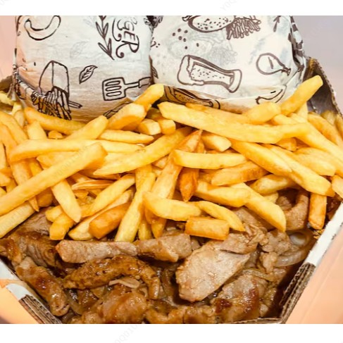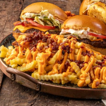 2 Hambúrgueres1: Pão de Brioche, Hambúrguer de Costela de 130g, Queijo Cheddar, Bacon em tiras, Alface Americana e Tomates. Acompanha Fritas com Cheddar e Bacon