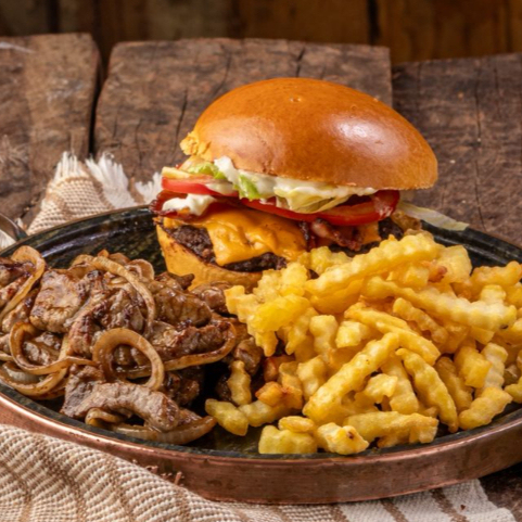 1 hambúrguer artesanal (Pão com fresquinho com gergelim, suculento hambúrguer de 130g, cheddar cremoso, bacon e tiras, alface e tomate), 200g contra filé acebolado ao molho de alho e 400g batata frita.