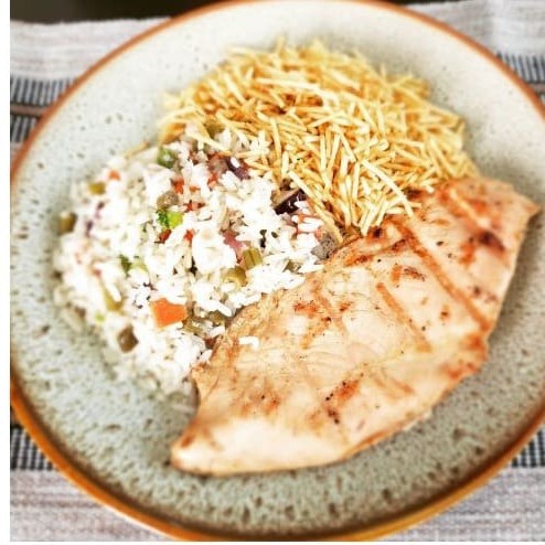 "Uma combinação irresistível! Filé de peito de frango grelhado, preparado no ponto perfeito, acompanhado de arroz à grega com legumes fresquinhos e batatas souté douradas e macias. O equilíbrio entre sabor e leveza que você procura."""