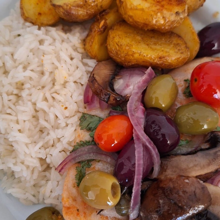 Tilápia grelhada no ponto certo, com um toque mediterrâneo que encanta: molho especial de azeite, pimentões vibrantes, cebola roxa, azeitonas, alcaparras, cogumelos e tomate-cereja. Finalizado com arroz branco soltinho e batatas rústicas Douradas. Uma combinação inesquecível!
