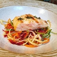 Leveza e sofisticação em um só prato! Nosso salmão grelhado, suculento e dourado, é servido com um espaguete de legumes fresquinhos, envolvido em um aromático molho pesto. Uma combinação perfeita para quem busca sabor e equilíbrio.