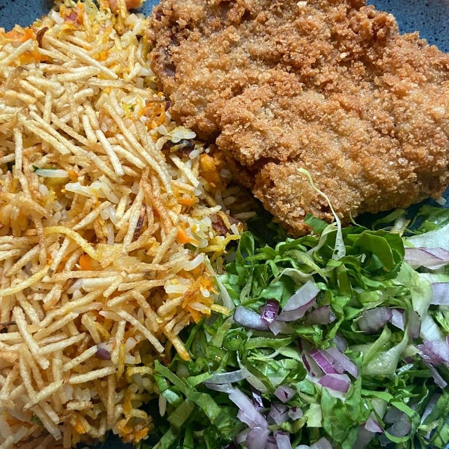 Crosta dourada e suculência sem igual! Bife de filé mignon empanado na farinha panko, garantindo uma crocância incomparável. Acompanhado de arroz biro-biro soltinho e saboroso, além de almeirão fresco para equilibrar a refeição. Simplesmente irresistível