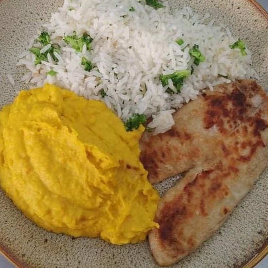 Uma refeição que combina sabor e nutrição! Tilápia grelhada, suculenta e temperada na medida, servida com arroz enriquecido com brócolis e um purê de moranga aveludado. Perfeita para quem busca uma opção leve e saborosa.
