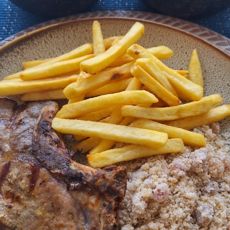 Um prato especial para quem ama sabor e qualidade! Carré suíno grelhado no ponto perfeito, servido com arroz branco soltinho, batata frita crocante, uma farofinha de bacon irresistível e um super vinagrete fresco. Uma combinação que encanta em cada detalhe!