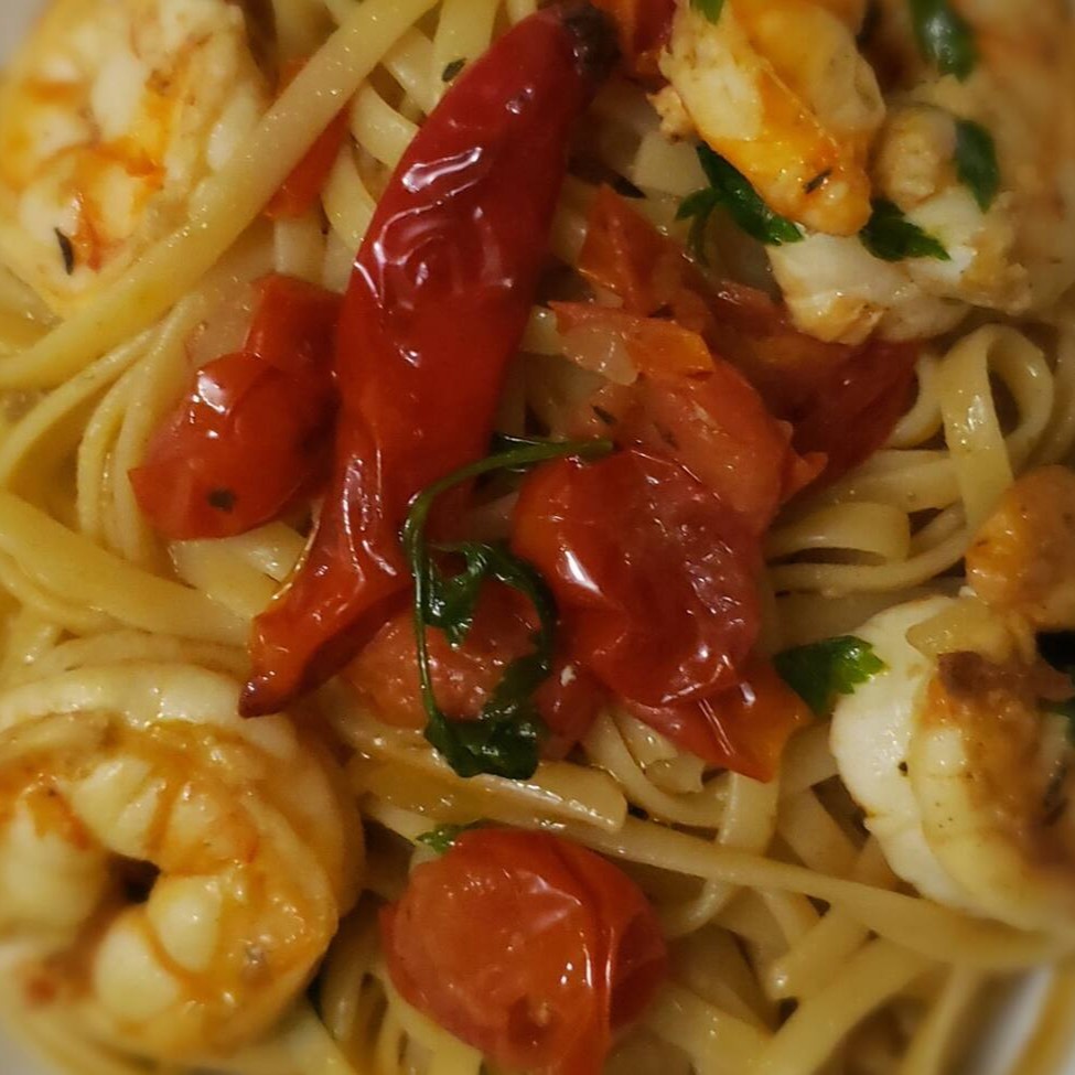 Nosso talharim é combinado com camarões médios e camarão pistola , realçados por tomates confit que derretem na boca. Uma refeição cheia de frescor e personalidade.