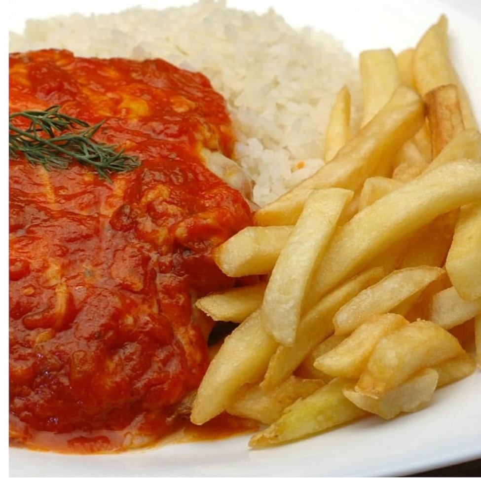 Filé empanado, crocante por fora e macio por dentro, coberto com uma camada generosa de muçarela derretida e molho de tomate caseiro. Acompanha arroz soltinho e batata frita douradinha para completar a experiência.