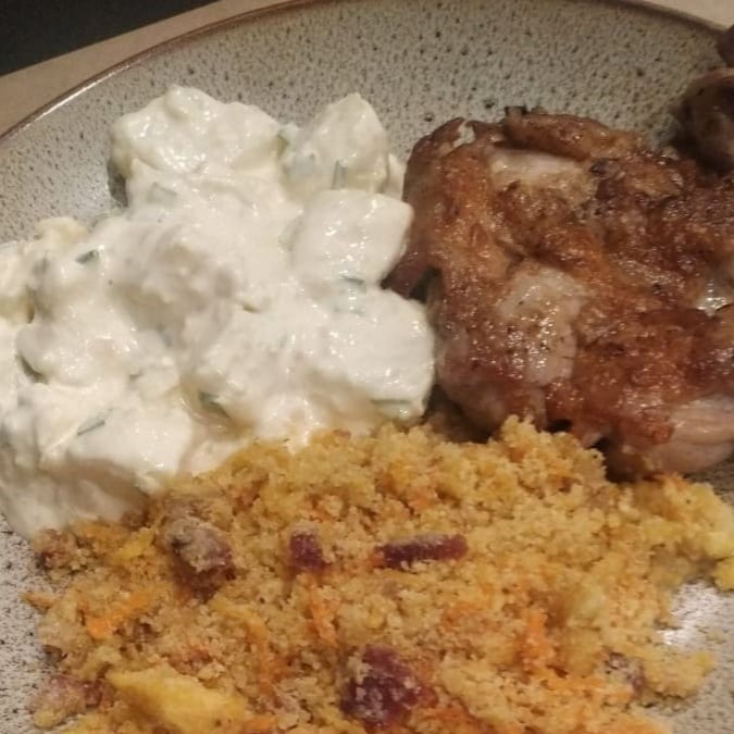 Uma refeição que aquece a alma! Sobrecoxa desossada, grelhada para manter a suculência perfeita, acompanhada de arroz branco soltinho e maionese de batata , leve e cremosa.