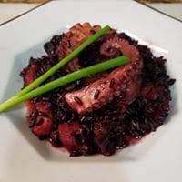 "Uma verdadeira obra-prima da gastronomia! Arroz negro, cozido à perfeição, harmonizado com tentáculos de polvo macios e um mix de ervilhas frescas e alho-poró . Um prato que une sabores intensos e elegância."""
