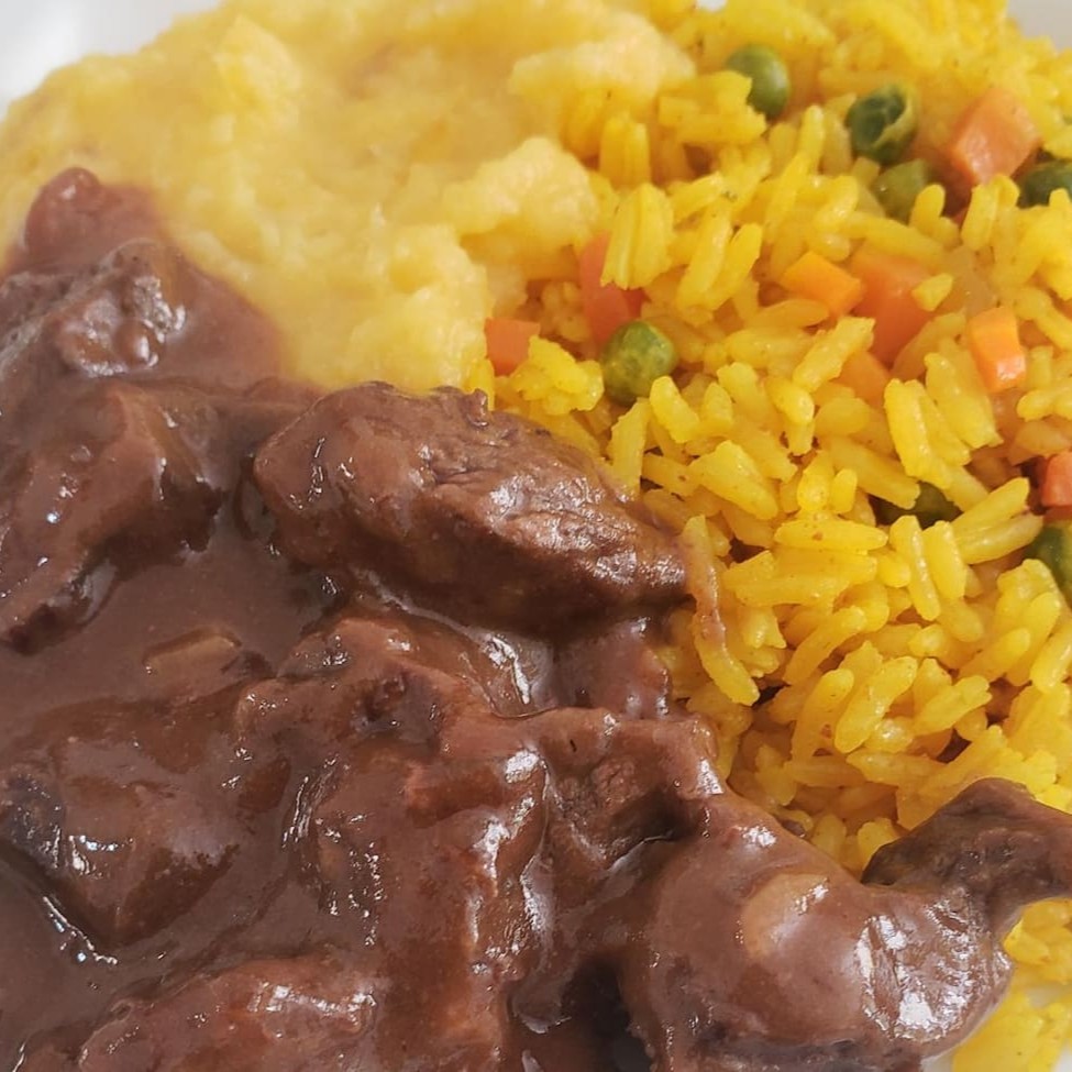 Uma combinação que encanta! Picadinho de filé suculento e temperado na medida, harmonizado com arroz de açafrão dourado e um purê de batata aveludado. O equilíbrio perfeito para uma refeição caseira e sofisticada.