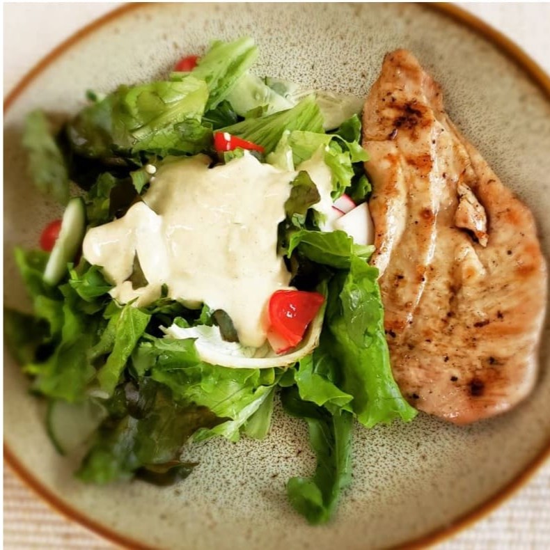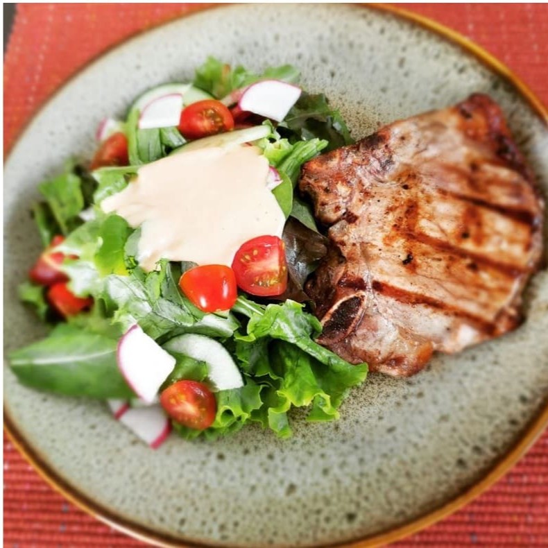 Frescor e sabor em harmonia! Um mix de alface crespa, alface roxa, rúcula, rabanete crocante, pepino fresco e tomate-cereja suculento, acompanhado de um carré suíno grelhado no ponto certo, macio e bem temperado. Leveza com um toque especial.