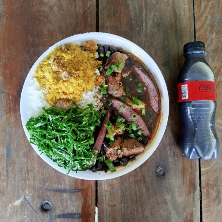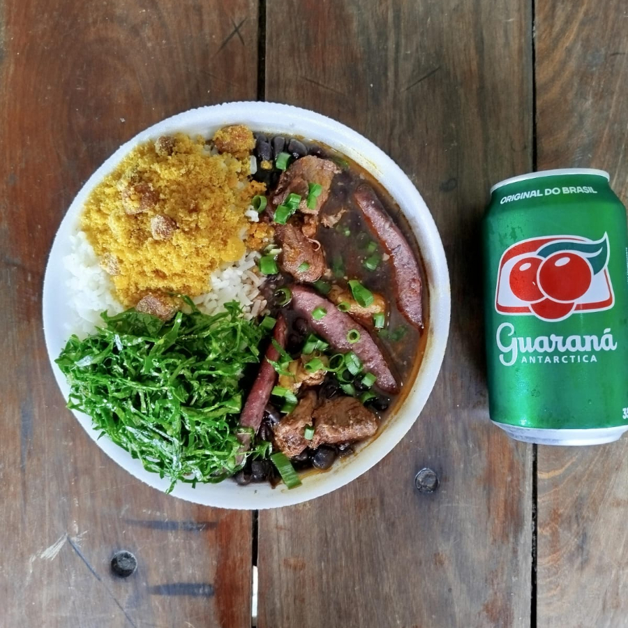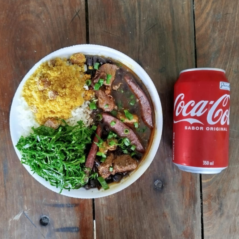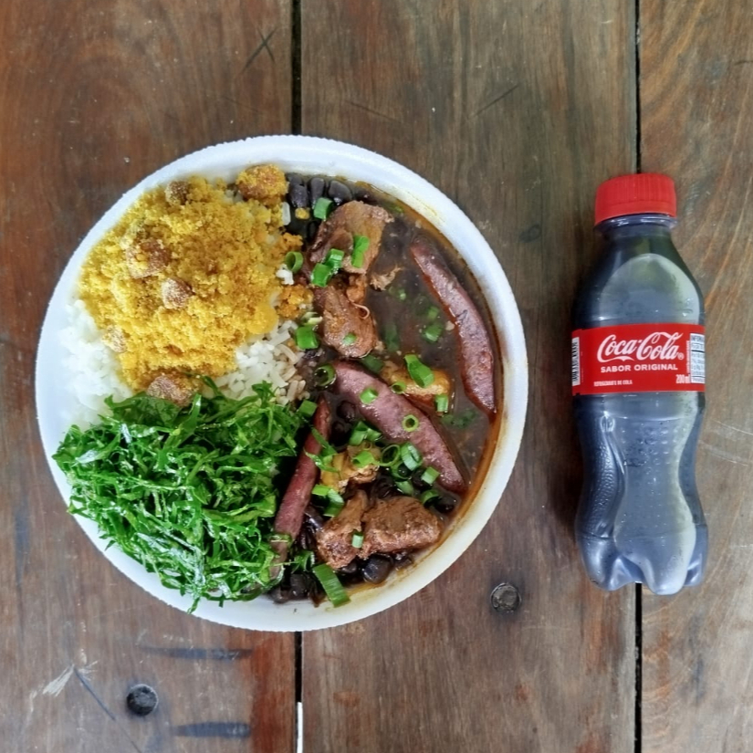 Deliciosa feijoada magra (pernil, bacon e calabresa) acompanha arroz, farofa e couve.