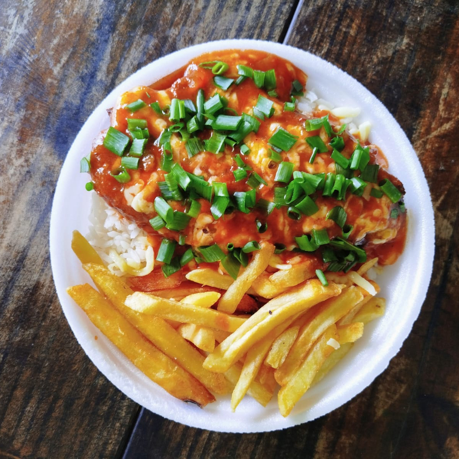 Parmegiana de frango, delicioso empanado de frango coberto com queijo e molho de tomates, acompanha arroz branco e batata frita