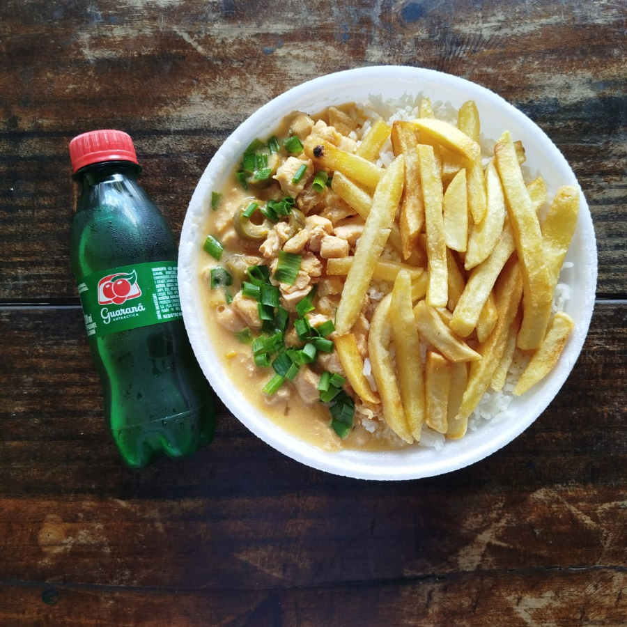 Estrogonofe de frango com molho cremoso, milho verde e azeitona, acompanha arroz branco soltinho e batata frita.