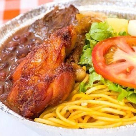 Acompanha sabaroso arroz, feijão , costelinha de porco, batata frita,salada da casa