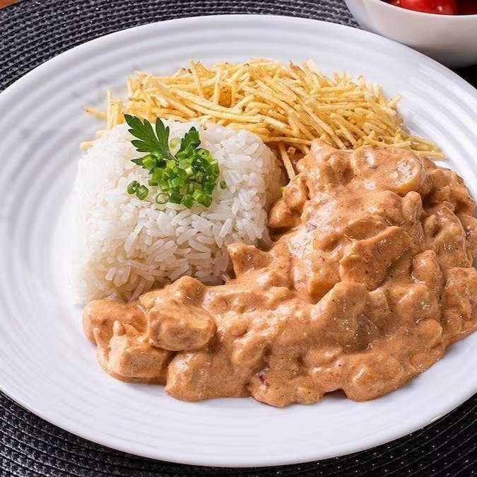 Cremoso e irresistível! Nosso strogonoff é feito com filé de frango selecionado, no molho perfeito, e acompanha arroz soltinho e batata palha saboroso. Uma combinação clássica e cheia de sabor!