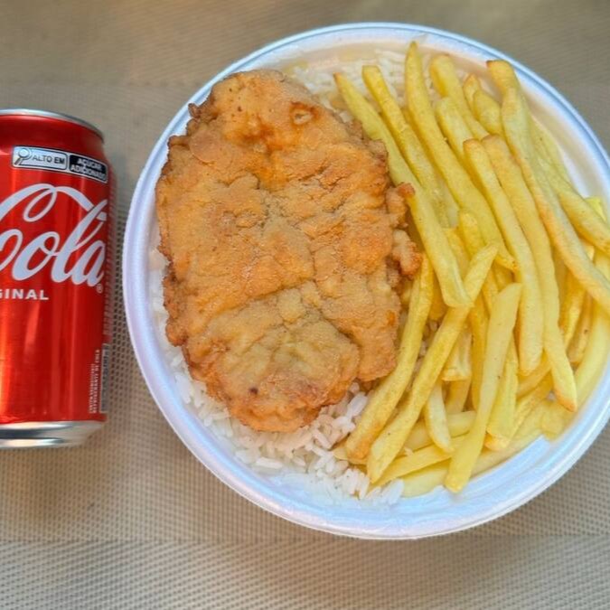 Marmita com delicioso filé de frango empanado na massa crocante acompanhado de arroz branco, feijão e batatas fritas. Acompanha refrigerante lata Coca Cola 350ml bem gelada. Marmita indicada para 01 pessoa.