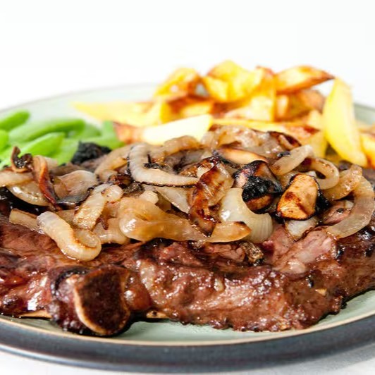 Delicioso Filé de Boi Selecionado acebolado com batata frita (Acompanha arroz, feijão e fritas).