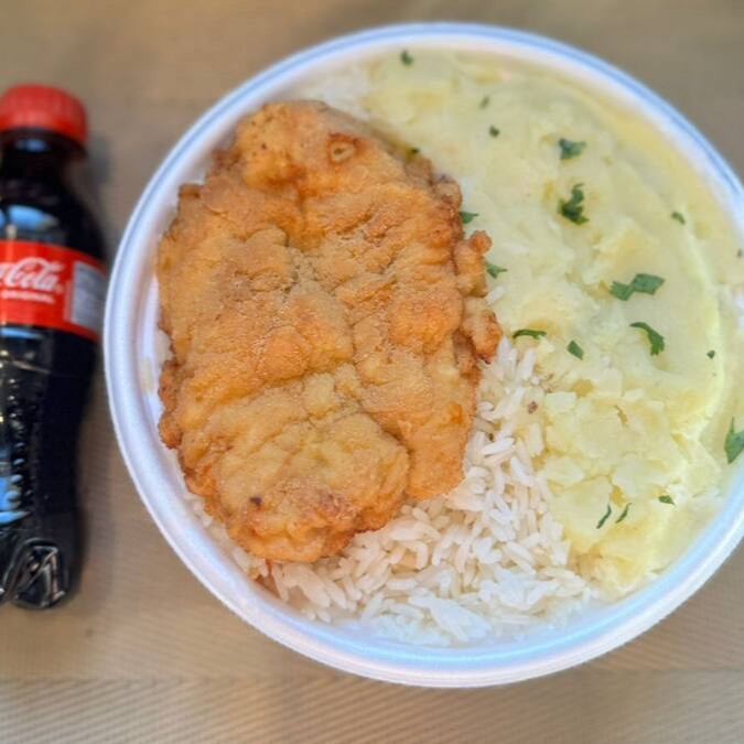 Delicioso filé de frango a milanesa, acompanhando arroz branco, purê de batatas e feijão do Dia.