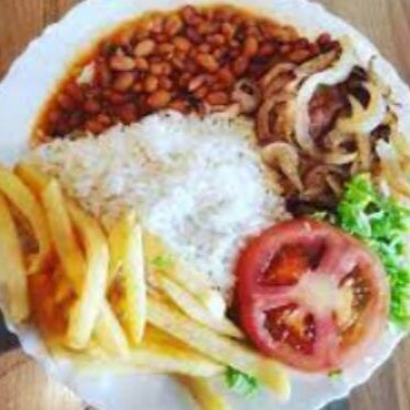 Acompanha arroz, feijão carioca, batata frita + salada com tomate, cenoura e beterraba e molho rose.