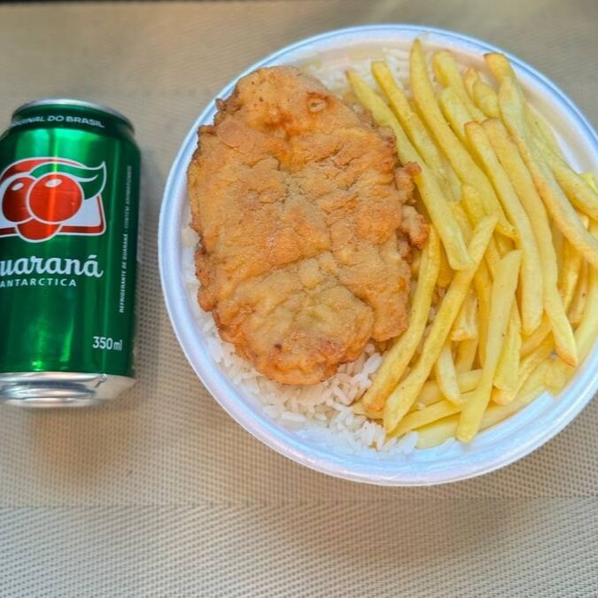 Marmita com delicioso filé de frango empanado na massa crocante acompanhado de arroz branco, feijão e batatas fritas. Acompanha refrigerante lata Guaraná Antárctica lata 350ml bem gelada. Marmita indicada para 01 pessoa.