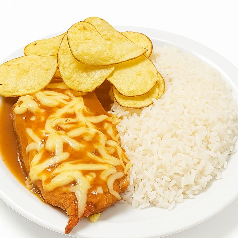 Preparado Com Filé De Frango, Molho De Tomate, Coberta Por Um Irresistível Queijo Derretido, Criando Uma Crosta Dourada E Saborosa. Servido Com Arroz Soltinho E Batata Chips, É A Refeição Perfeita Para Satisfazer Seu Apetite.