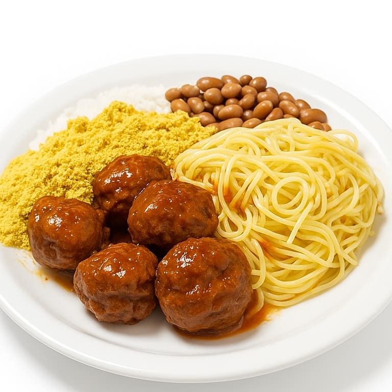 Almôndegas Suculentas Mergulhadas Em Um Molho Artesanal Delicioso, Servidas Com Arroz Soltinho, Feijão Bem Temperado, Macarrão Ao Alho E Óleo, Farofinha Caseira E Batata Chips Crocante. Sabor Caseiro Que Abraça O Paladar Em Cada Garfada!