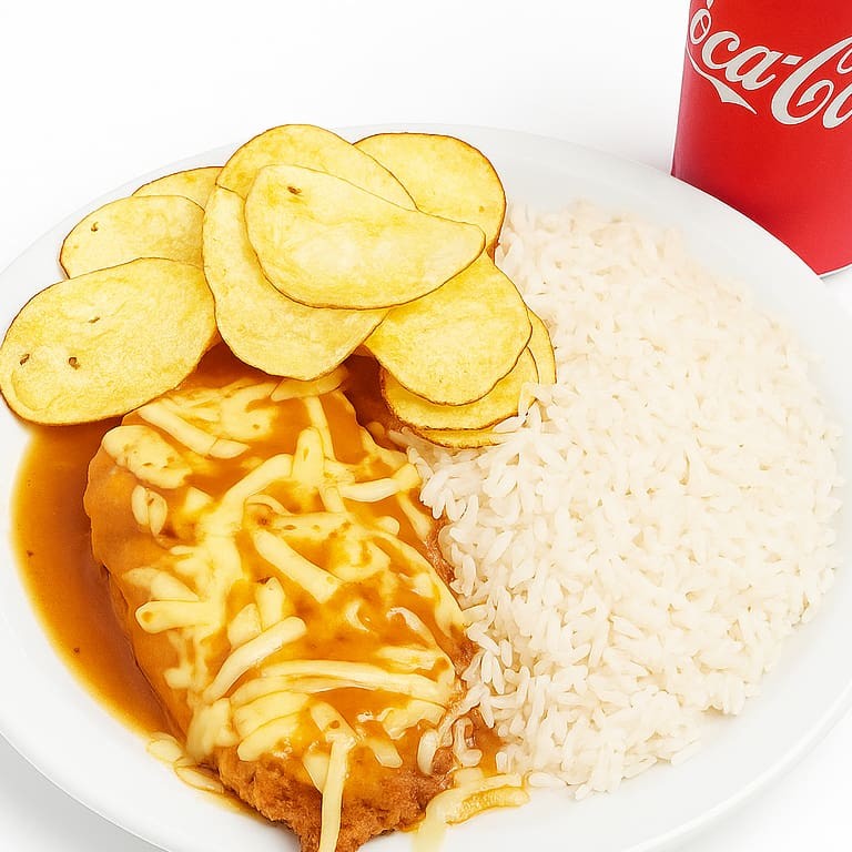 Preparado Com Filé De Frango, Acompanha Uma Camada Generosa De Molho De Tomate, Coberta Por Um Irresistível Queijo Derretido, Criando Uma Crosta Dourada E Saborosa. Servido Com Arroz Soltinho, Chips Crocantes De Batata E Uma Coca-Cola Gelada Para Completar Seu Almoço!