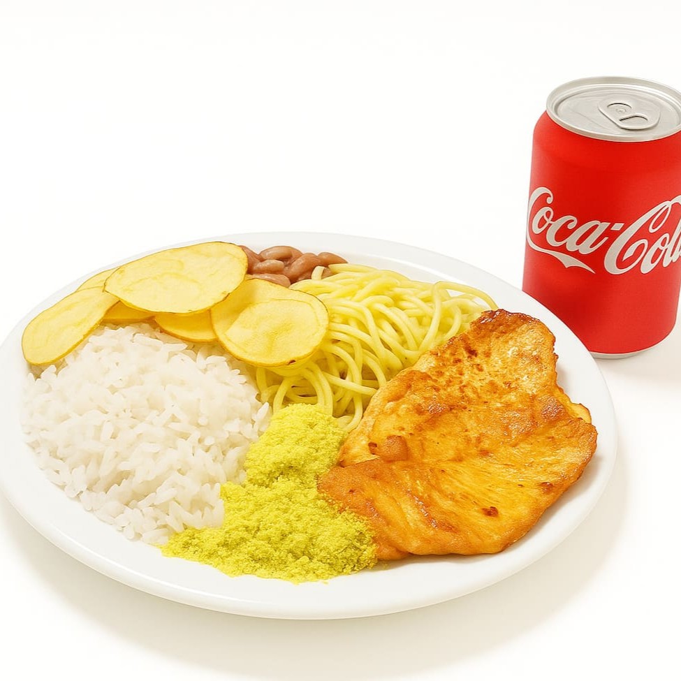 Aquele Pf de respeito! Arroz fresquinho, feijão do Dia, macarrão bem temperado, farofa crocante, batata chips e uma proteína a sua escolha. Uma refeição caseira, saborosa e com aquele gostinho especial que dá vontade de repetir! Além de acompanhar uma coca cola de 220 ml.