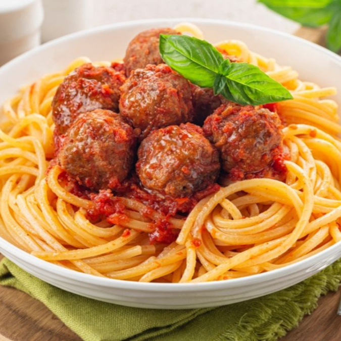 Espaguete soltinho + almôndegas caseiras bem temperadas e um molho de tomate super saboroso. Combinação perfeita para quem ama massa e quer matar a fome com muito sabor! Serve muito bem uma pessoa.