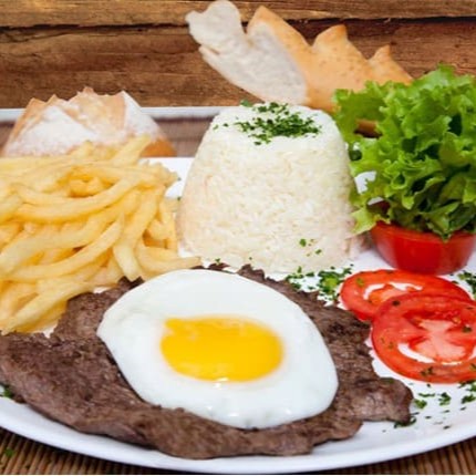 Bife a cavalo | acompanha arroz feijão comum 1 bife de contra file 1 ovo frito farofa batata frita e salada