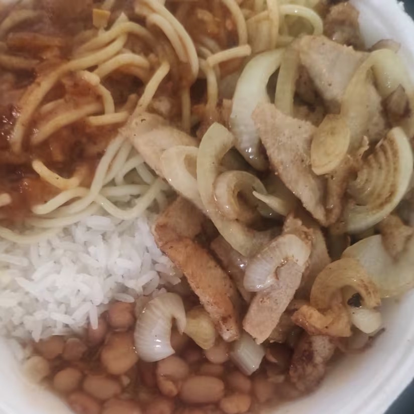 Arroz, feijão macarrão, salada e bife de lombo a palito acebolado