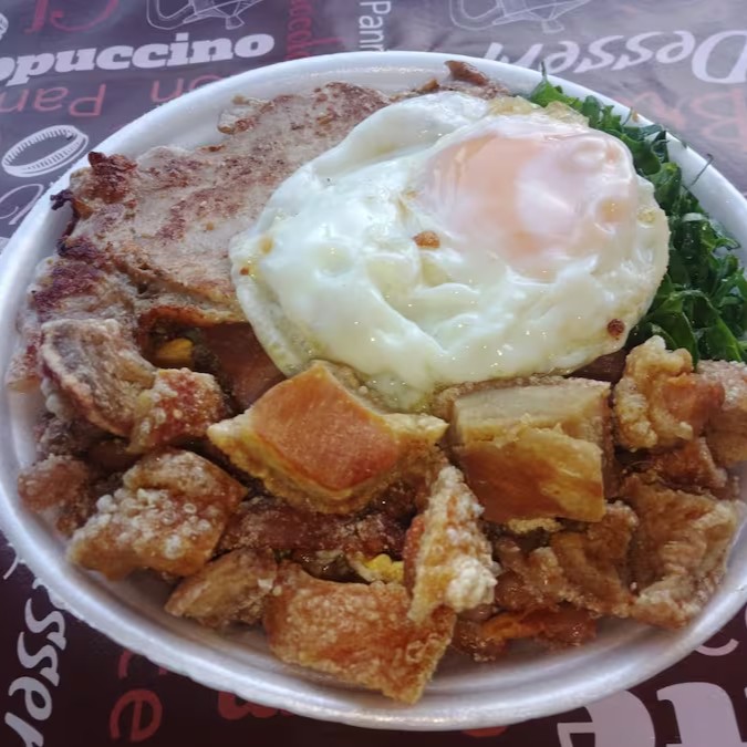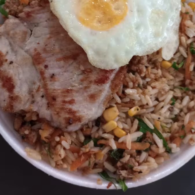 Arroz, bacon, calabresa, cenoura, milho, bife de lombo e um ovo frito