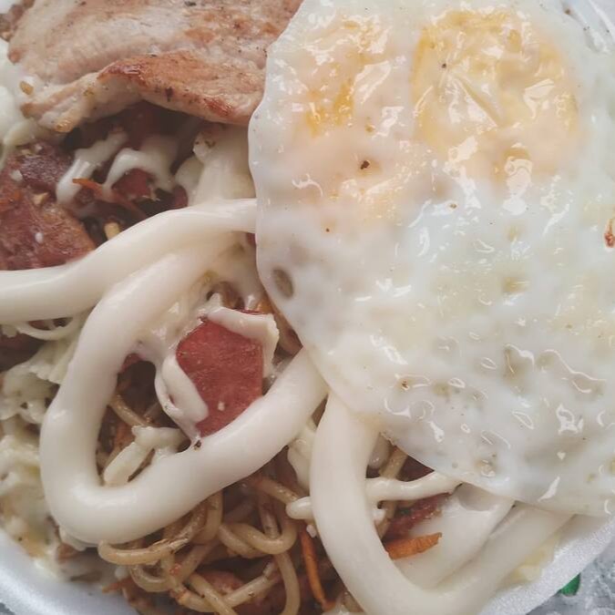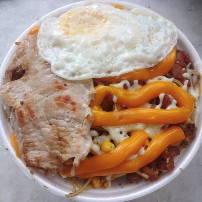Macarrão, bacon , calabresa, milho, cenoura, mussarela, Catupiry, bife de lombo e ovo frito