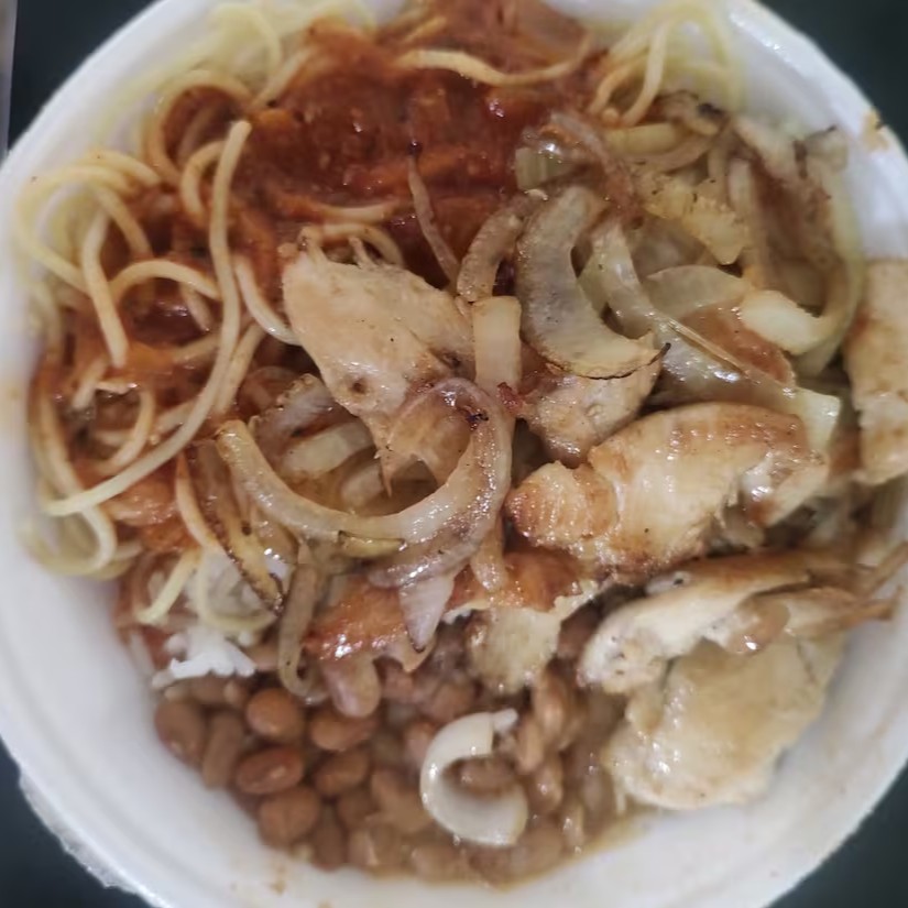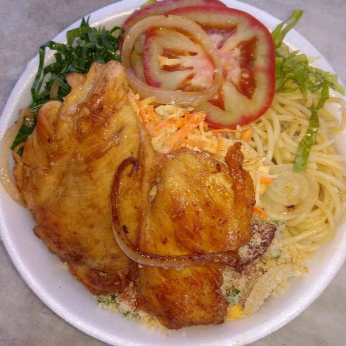 Arroz, feijão, batata frita, macarrão, salpicão, salada e bife de frango