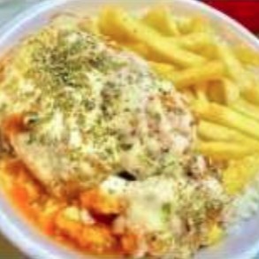 Arroz, feijão, batata frita, parmegiana de frango e salada (alface e tomate).