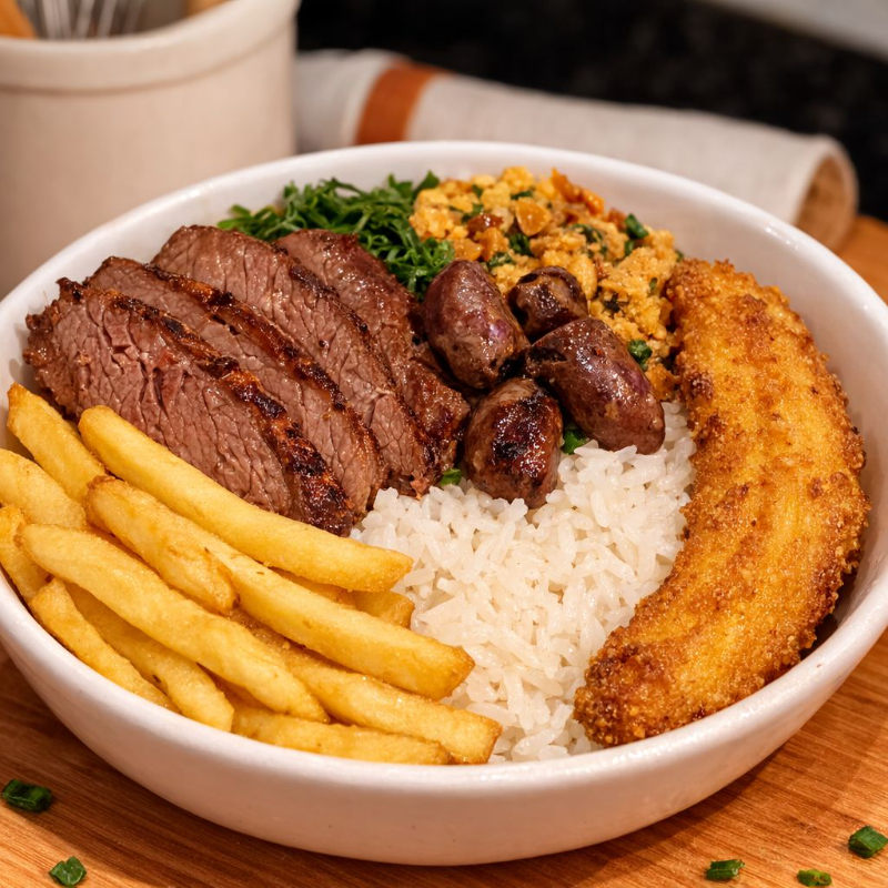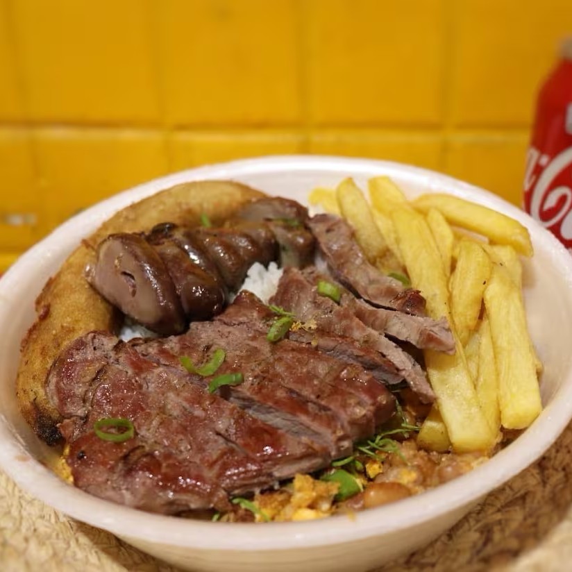 Combo: Marmitex grande de miolo de alcatra e linguiça, acompanhamento arroz, feijão tropeiro ou feijão comum, fritas e banana à milanesa + 1 Coca-Cola Lata de 350ml.