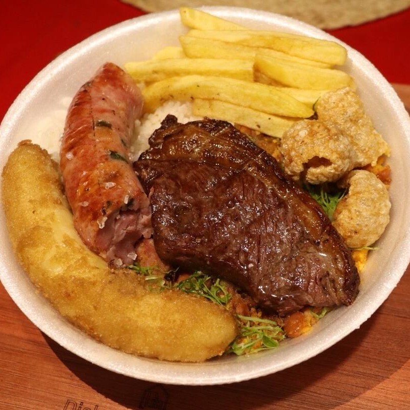 Marmitex grande de alcatra e coração, acompanhamento arroz, feijão tropeiro ou feijão comum, fritas e banana à milanesa.