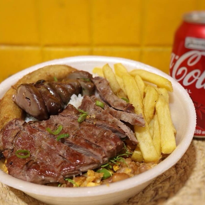 Combo: Marmitex grande de alcatra e coração, acompanhamento arroz, feijão tropeiro ou feijão comum, fritas e banana à milanesa + 1 Coca-Cola lata 350ml.