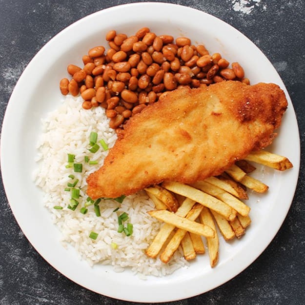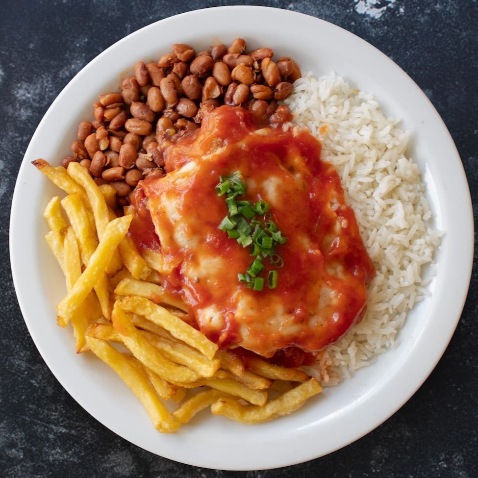 Filé de frango a parmegiana. A marmita acompanha arroz branco, feijão e batata frita caseira.