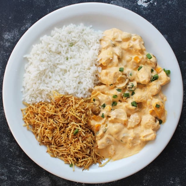 Strogonoff de frango. A marmita acompanha arroz branco e batata palha.