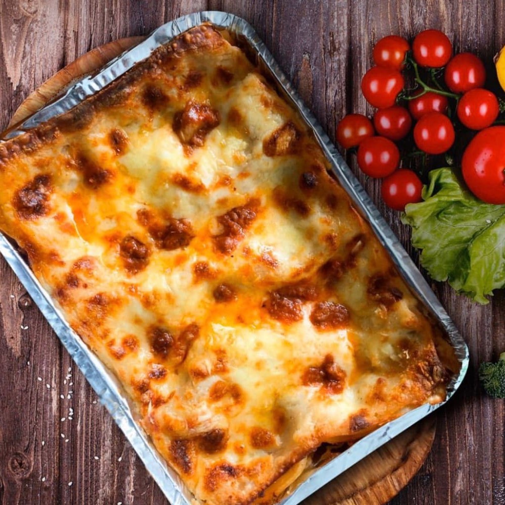 Massa de lasanha, molho a sua escolha, bacon, calabresa, presunto, mussarela, milho, azeitona, cebola, tomate, pimentão, orégano, pimenta calabresa